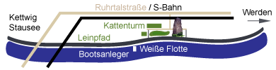 - Wir sind ganz einfach zu finden. Fahren Sie von Kettwig kommend Richtung Werden bzw. umgekehrt auf der „Ruhrtalstraße” parallel zur Ruhr. Kurz vor dem Ortseingang zu Kettwig biegen Sie von Kettwig kommend rechts ab bzw. von Werden kommend links ab. Neben der Zufahrtsstraße befindet sich eine Bushaltestelle der Linie 190 Kettwig-Werden (Fußweg 1 Minute). Mit dieser Busverbindung können Sie bequem ohne eigenen Pkw zu uns gelangen.